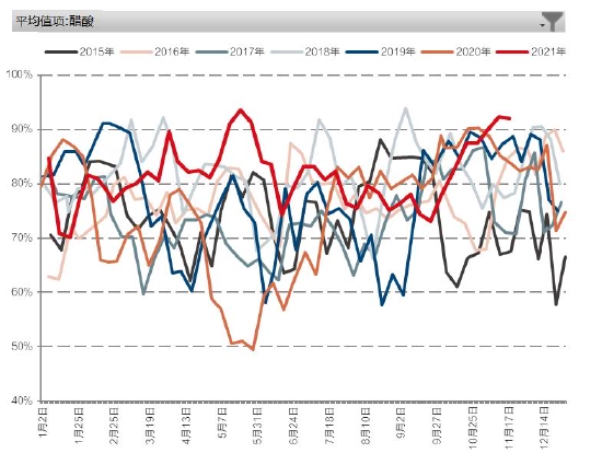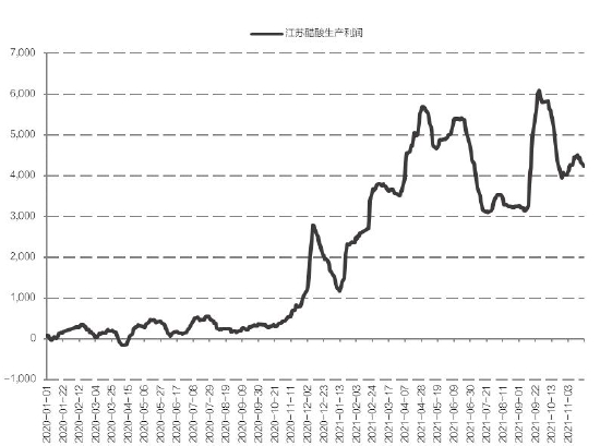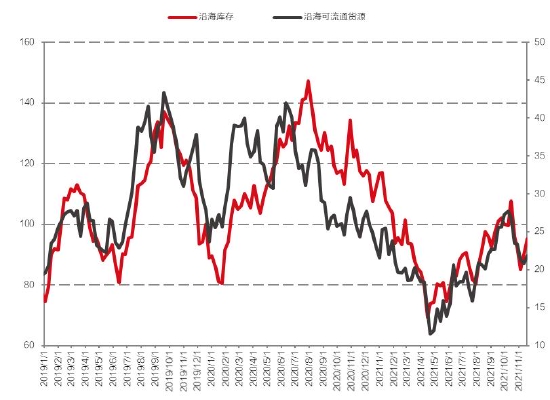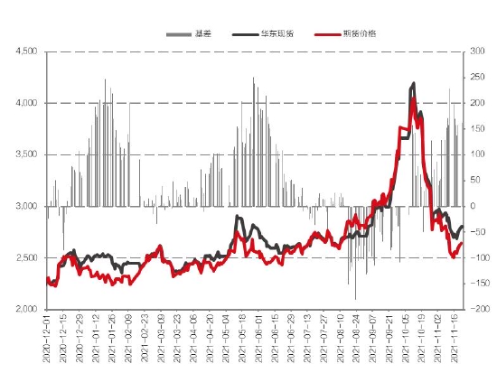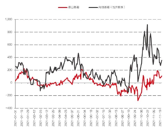 基差方面,2021年基差大多维持在小幅升水状态,内地基差受供应缩减影响,略强于港口基差。港口累库不及往年,库存压力不大,截止11月底港口现货升水100元/吨左右,较年初走强了40元/吨;内地由于停产情况增多,厂家库存一直未有明显累积,现货价格较为强势,基差较年初也有所走强。