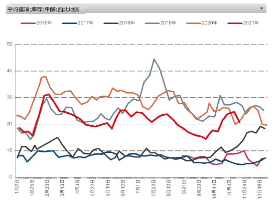 2021年中国港口甲醇库存均值90万吨,较2020年库存水平大幅下降22%,沿海整体压力不大。累库不及往年,一方面是由于进口量的收缩,另一方面也反应了国内需求的强劲和市场交投气氛的好转。同时,区域间改港的进口船货明显增多,部分进口船货直接进入保税罐中,减少了港口可流通货源的释放。三季度起,沿海外采甲醇的烯烃装置降负或停车,港口库存迅速累积,再次突破100万吨。截止11月底沿海甲醇库存92万吨,仍比同期库存水平减少20%左右,可流通货源23万吨左右,沿海压力仍未有明显累积。