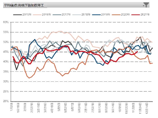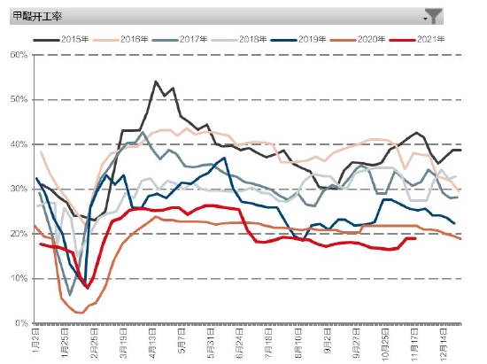 2021年中国甲醇下游消费结构变化不大,仍然维持重心在石化替代领域,主要表现为甲醇制烯烃、甲醇燃料等新兴下游的迅速发展。2021年甲醇下游平均加权开工率约为69%,与2020年基本持平。其中传统下游平均加权开工率约43%,较2020年上涨6%。