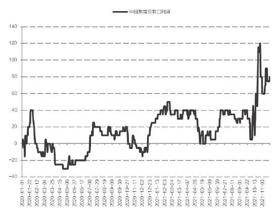 进口量环比缩减,转口贸易增多,港口累库不及往年。2021年中国甲醇进口量预计约1100万吨,环比2020年跌幅14%,月均进口量90万吨左右,远低于20年108万吨的水平。这主要是由于2021年我国进口价格一直处于全球价格较低水平,不过仍然维持顺挂,全年进口平均利润150元/吨左右,较2020年平均进口利润下滑14%。转口东南亚窗口大部分时间打开,且转口利润远高于往年。国外供应商可流通资源优先去往高价区域,国内进口商也会选择转口获利。2021年中国甲醇出口量预计将突破40万吨,同比增加230%。