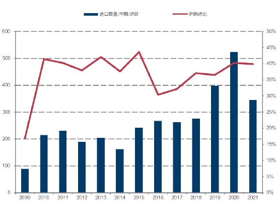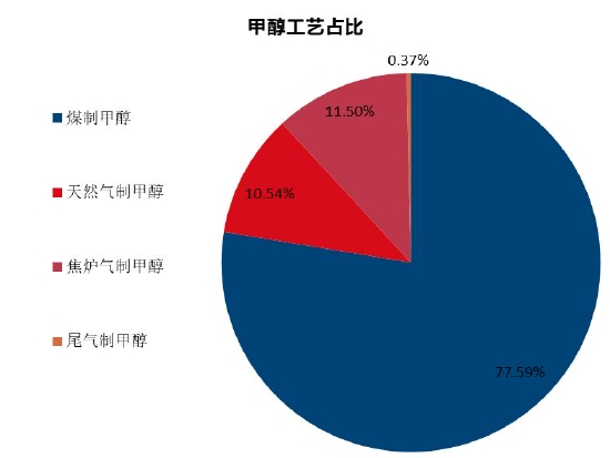 2021年中国甲醇总产能超过一亿万吨,年产能增速约为10%。其中从工艺来看,煤制甲醇产能占比持续提升至77.6%,主要集中于西北地区;天然气制甲醇占比为10.5%,主要分布在西北和西南地区;焦炉气制甲醇占比为11.5%,主要分布在华北和西北地区。从地区分布来看,西北地区为我国的主产区,产能占比约35%,其次是华北和华东区域,分别占全国产能29%和18%左右,产业集中程度相对较高。