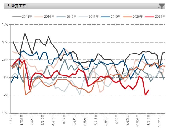 截止11月底,国内上游动力煤逐步企稳,下游MTO利润略有修复、开工逐步增多,同时在天然气紧张的背景下,进口有缩量预期,甲醇2600元/吨下方空间有限。2022年整体来看,甲醇基本面支撑仍在,价格或维持震荡格局。