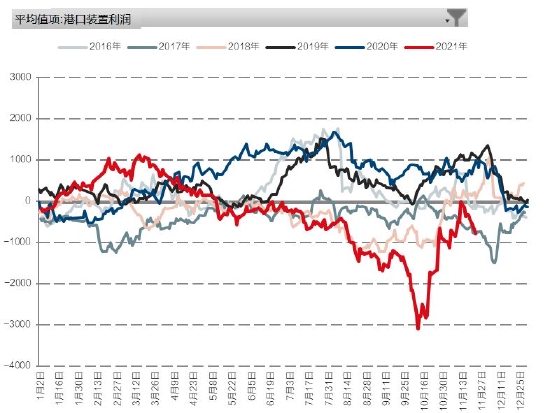 2021年国内外能源价格均大幅上涨,国内煤炭价格不断创造新高,产区煤制甲醇自5月起现金流击穿成本线。10月国家发改委发布严格限价政策,对煤炭进行宏观调控。表示将充分运用一切必要手段,研究对煤炭价格进行干预的具体措施,促进煤炭价格回归合理区间,并在郑商所调研期间指出将加强监管、严厉查处资本恶意炒作动力煤期货有关情况。动力煤价格受政策调控迅速回落,甲醇也跟随煤化工板块集体下行,煤制企业仍处于亏损状态。2021年内地煤制利润年均值-93元/吨,生产企业已连续两年亏损,不复2019年以前煤制甲醇企业高利润的状态。如发改委政策基准价政策实施,根据500元左右的坑口价计算,内地甲醇生产成本在1850元/吨左右,折盘面价格在2400元/吨,2022年甲醇期货下方空间有限。