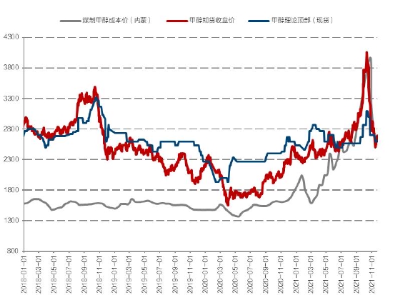 甲醇作为中间工业品的特性决定了其价格上有顶下有底,价格底部受到国内煤制生产成本的支持,顶部受到下游烯烃利润的制约。2021年甲醇产业链上下游利润均大幅收缩,截止11月底,甲醇理论运行底部2680元/吨,理论运行顶部2600元/吨,整体理论运行区间举步维艰。且受煤炭政策的影响,生产企业开工并不仅是受到利润的影响,因此下半年理论边界线略有失效。