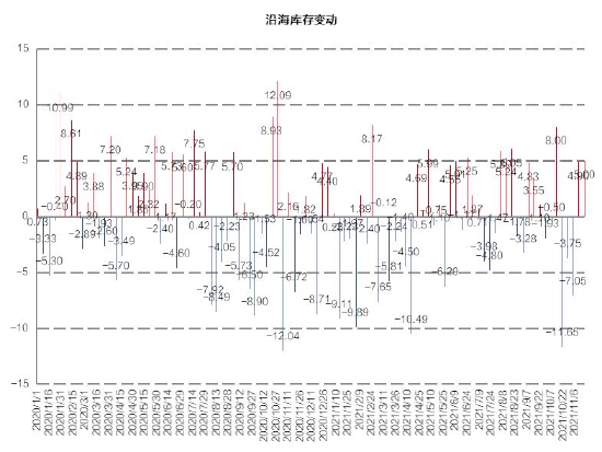 内地库存方面,西北代表企业库存较2020年降幅25%。受能耗双控政策影响,甲醇企业严格控制开工负荷,往年超负荷生产情况不再,并且部分一体化装置烯烃重启,甲醇外采,上游生产企业库存维持低位区间,对内地价格形成支撑。