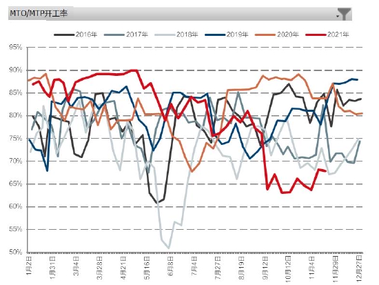 2021年甲醇制烯烃亏损严重,沿海外采装置年平均利润-350元/吨,较2020年大幅下滑。港口装置模拟利润最高达到1100元/吨,整体盈利仍然可观,开工稳定维持高负荷。5月份起沿海MTO装置理论现金流不断下滑,截止11月底外采甲醇制烯烃已经亏损超过7个月。港口利润驱使下,下半年MTO开工迅速下滑,沿海四套外采装置均有停车或降负,消耗甲醇数量明显下降,这几套装置每月产生约75万吨的甲醇需求,港口库存迅速累积,外采装置对甲醇上行空间形成压制。截止11月底,甲醇制烯烃装置平均开工负荷跌68%左右,较同期水平下滑将近20%。不过综合上半年的高负荷,2021年MTO装置平均开工80%,较2020年仅下滑2个百分点。