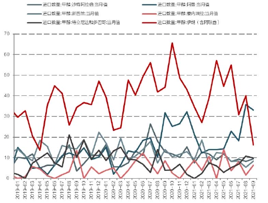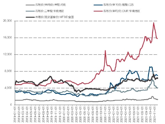 2021年国际原油整体呈现震荡走高格局,截止11月底在80美元/桶附近高位震荡,较年初涨幅66%。全球甲醇虽然并没有以原油为原料进行生产,但是由于甲醇作为一个资源性产品,一方面从宏观角度来看,原油引领大宗商品价格重心不断上移。另一方面,甲醇下游需求多与能源相关,包括燃料、MTBE、DME、烯烃等占甲醇总需求接近八成,甲醇价格受原油波幅影响明显。