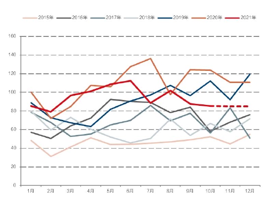 分装置来看,煤制装置年均开工率约75%,较2020年提升2个百分点,煤化工受政策影响较大,运行较往年波动较大,1-8月开工维持近五年来高位上沿,9月起煤制开工迅速下滑。天然气制装置年均开工率约48%,较2020年提升3个百分点,运行规律与往年相比变化不大,主要受季节性影响。