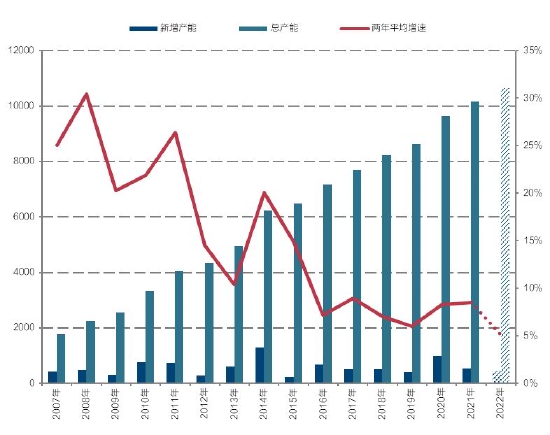 2021年计划投产超过900万吨产能,截止年末实际投放约550万吨,年增速5.6%。2022年投产计划放缓,固有新增约120万吨,加上延后的新增装置,2022年预计全年新增甲醇装置在470万吨左右,理论增速约4.6%。从地区来看,新增产能仍然集中在西北地区,煤制占比70%。考虑到化工企业投产多有延迟,因此综合两年平均增速来看2021年两年均增速在8.5%,2022年两年均增速预计约5%,国内产能稳步扩张,但增速逐渐放缓。