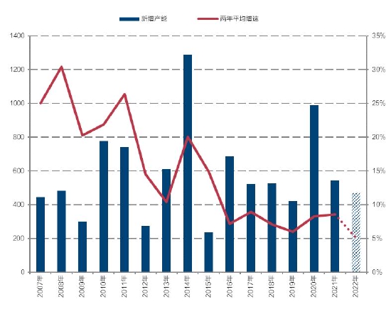 有机硅作为光伏、半导体等制造业的原料,未来五年将进入产能集中投放期,共有超过500万吨的新增装置计划投产,单体产能将超过650万吨,折合甲消费量370万吨以上。碳酸二甲酯作为锂电池电解液的主要原料之一,未来需求端也有较大的增长空间,未来五年有超过150万吨的产能待释放,折合甲醇消费量在100万吨附近。随着“禁塑令”的实施,可降解塑料需求增加较为明显,可降解塑料激活BDO需求,作为可降解塑料上游的BDO未来五年扩能超500万吨,折合甲醇需求约350万吨。不过化工产能建设周期较长、投资成本高,投产进度需关注,2022年由传统需求带来的增量大约在100万吨。