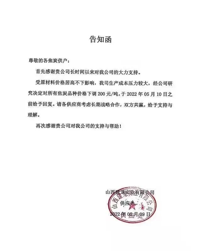 焦炭市场全面落实第一轮降价,降幅为200元/吨。昨日,有钢厂发出采购焦炭的调价函。函中指出:“钢材现货行情持续低迷,钢厂成本压力不断加大目前已严重亏损为了稳定供需双方长期的合作关系,现我公司决定对焦炭采购价格进行如下调整:对所有焦炭含税承兑出厂价下调200元/吨,望长期合作的各焦化供户于2022年5月10日之前给予回复。”